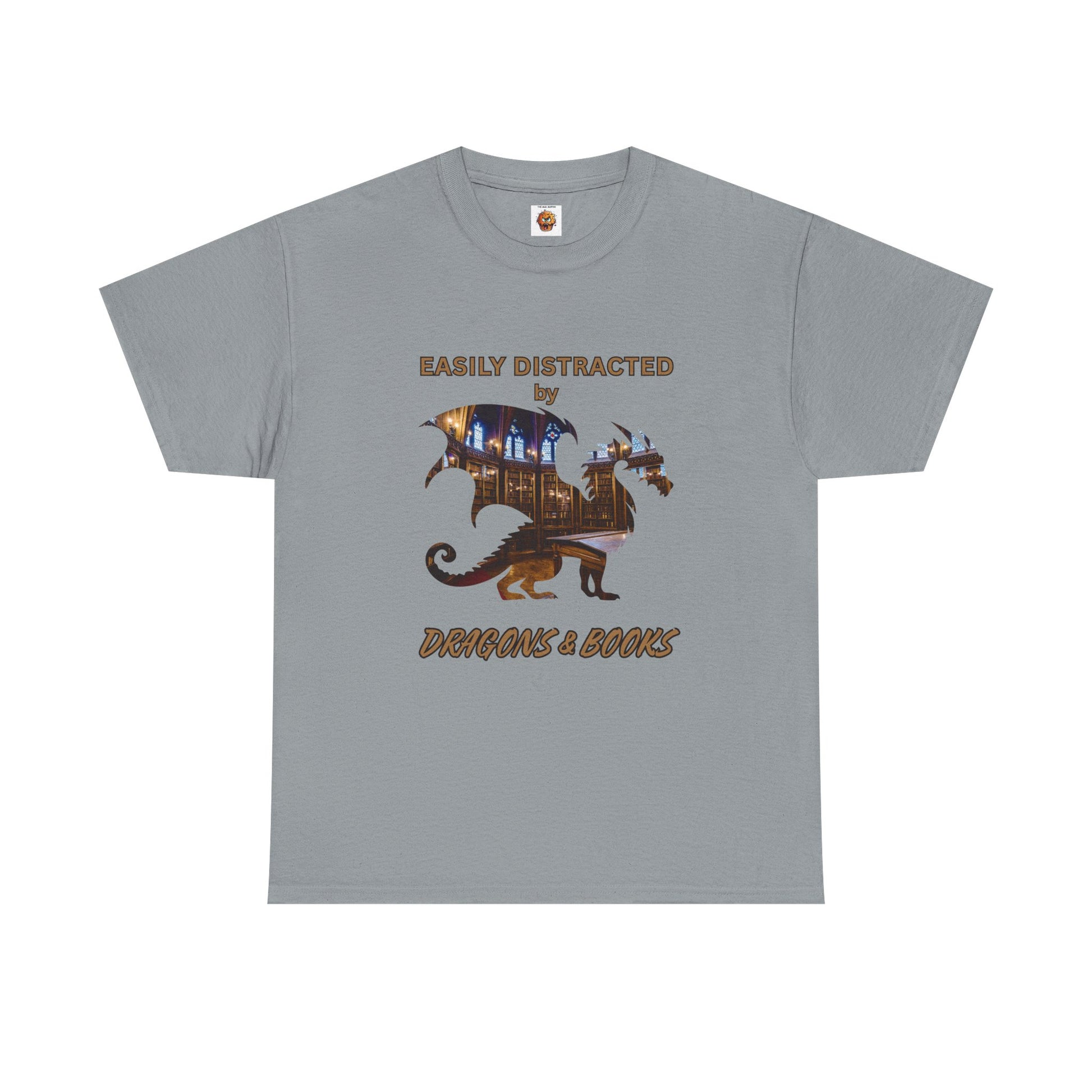 Easily Distracted by Dragons & Books Tee, Unisex Cotton T-Shirt for Book Lovers, Fun Gift for Fantasy Fans, Cozy Casual Wear, DND, RPG, TTRPG, Geek, Nerd